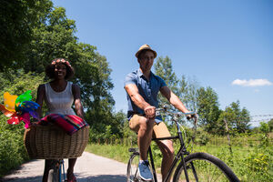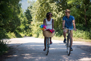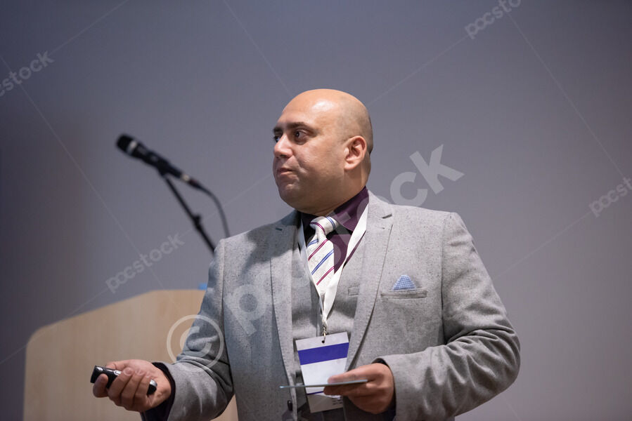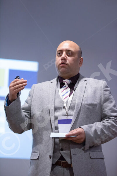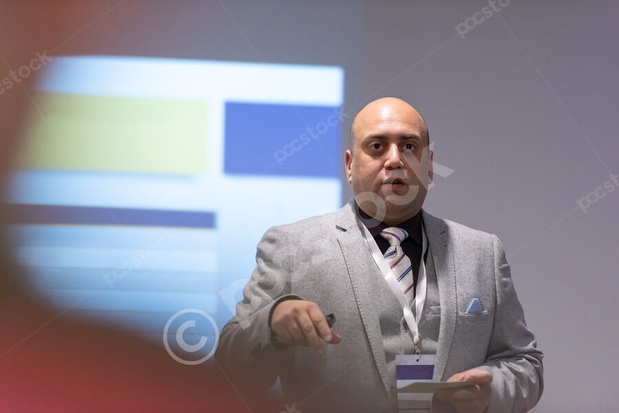 Middle Eastern man with headphones on neck working on his laptop while sitting at table with caucasian woman working together holding tablet standing in office