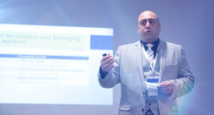 Middle Eastern businessman playing chess with caucasian colleagues while sitting on sofa in office