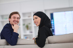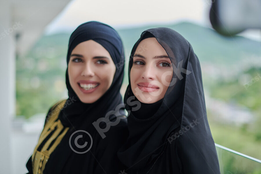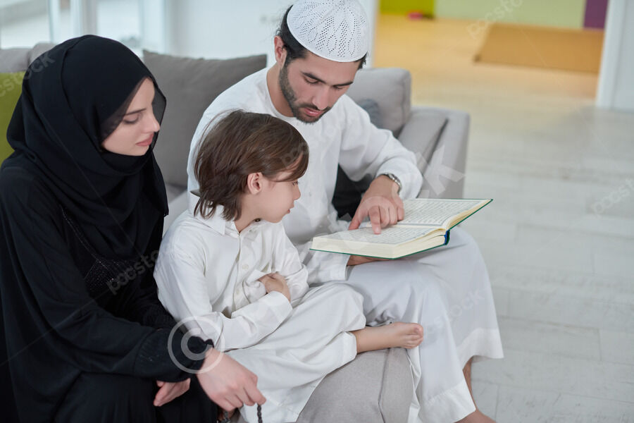 Middle Eastern family in traditional Muslim clothing looking up standing on gray floor at home