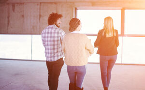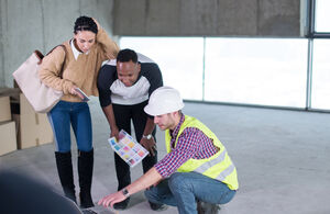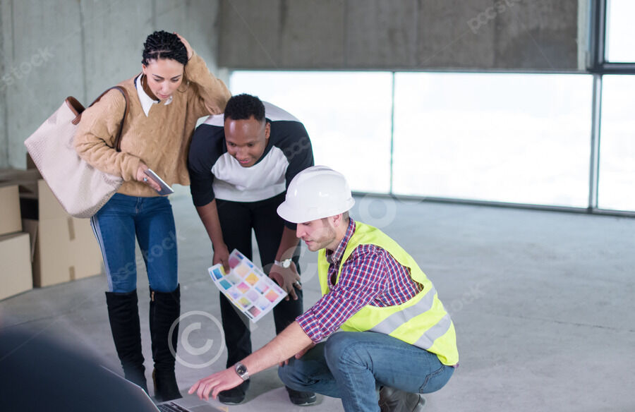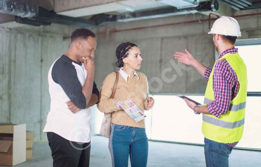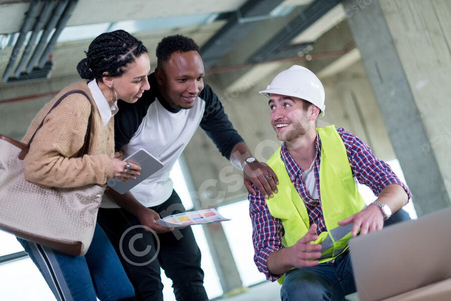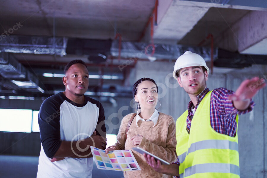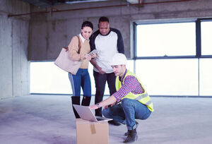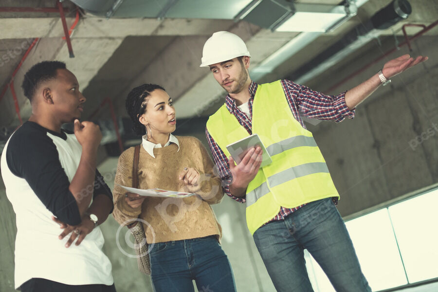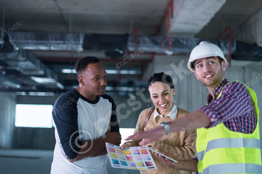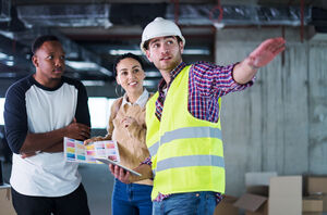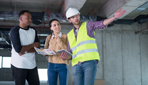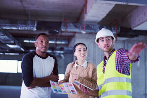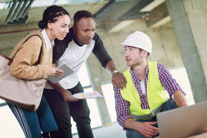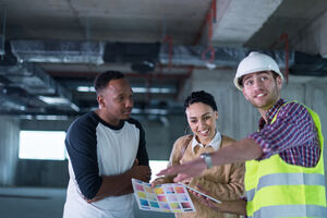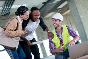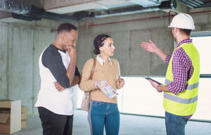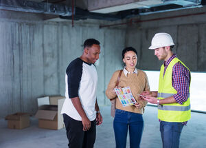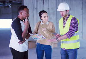 Middle Eastern woman and Black man standing and talking to caucasian male architect explaining plans inside the building