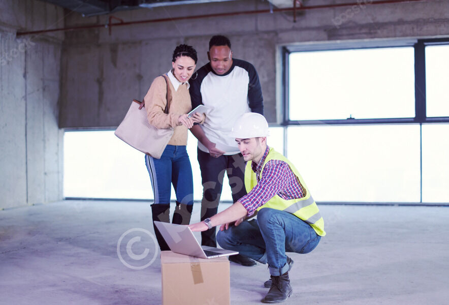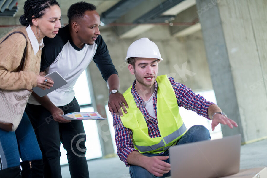 Middle Eastern woman and Black man standing and talking to caucasian male architect crouching showing plans using laptop inside the building
