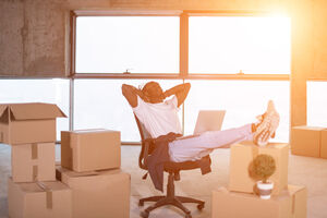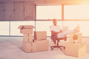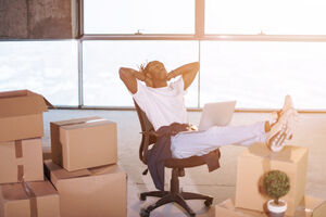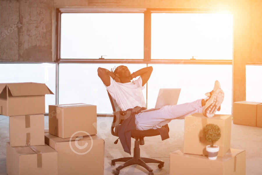 Smiling Black man using laptop lookinga way while sitting on office chair with hands behind head and feets on cardboard boxes in empty unfinished office building