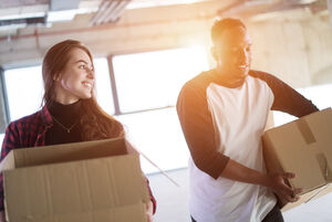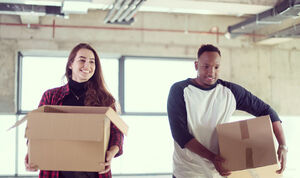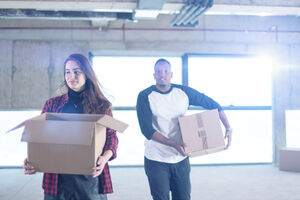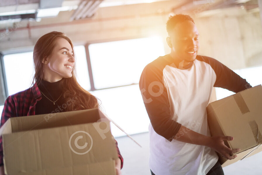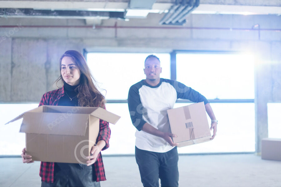 Smiling Black man and caucasian woman carrying cardboard boxes looking away while walking in empty unfinished office building