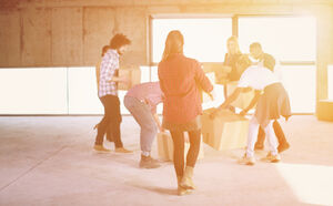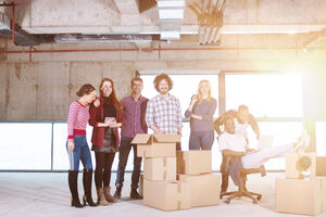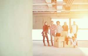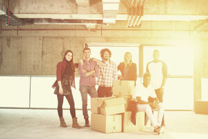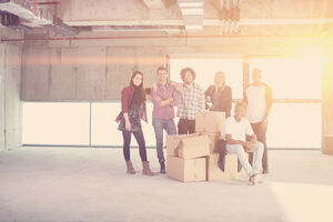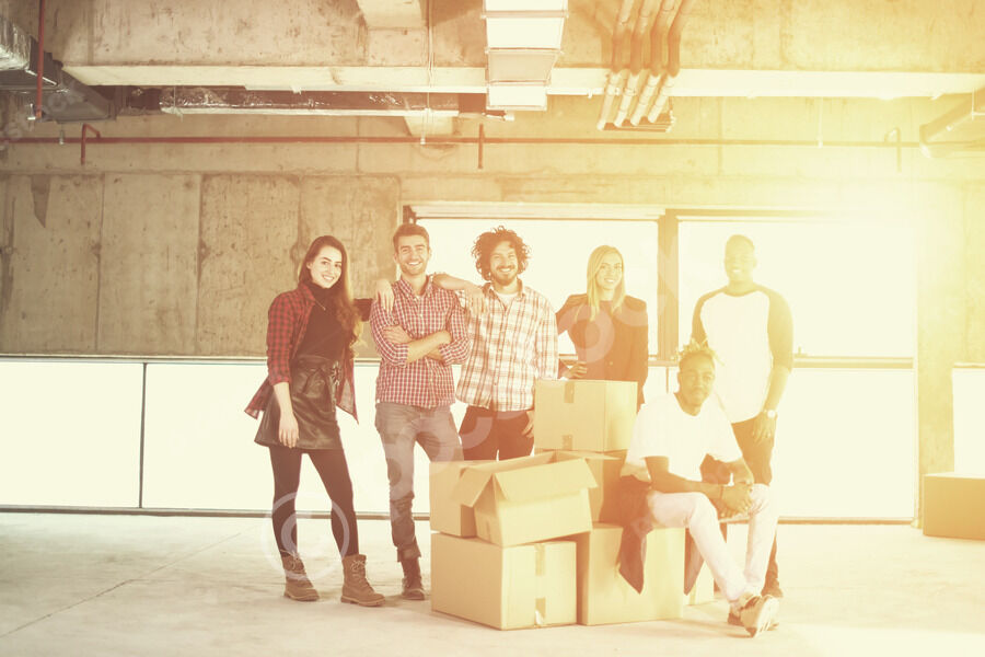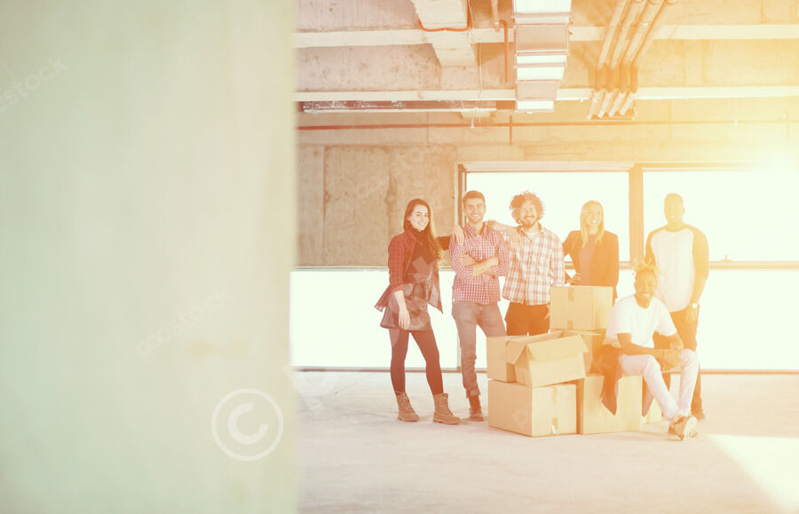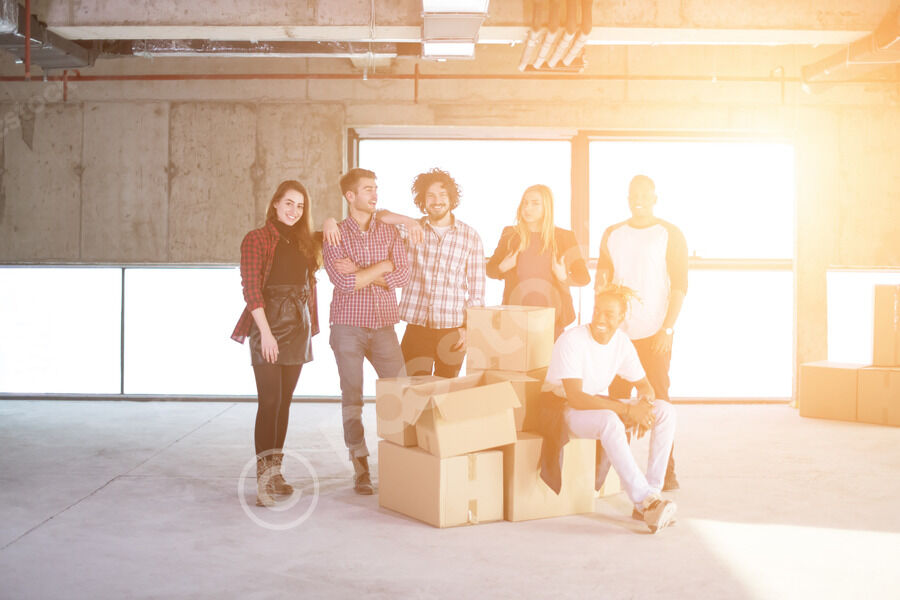 Group of diverse business people standing together with Black man sitting on cardboard boxes in empty unfinished office building