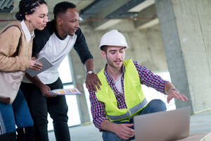 Middle Eastern woman and Black man standing and leaning forward talking to caucasian male architect crouching showing plans using laptop inside the building