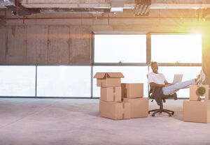 Smiling Black man using laptop sitting on office chair with feets on cardboard boxes in empty unfinished office building