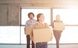Group of diverse business people looking away while walking and carrying cardboard boxes moving in empty unfinished office building