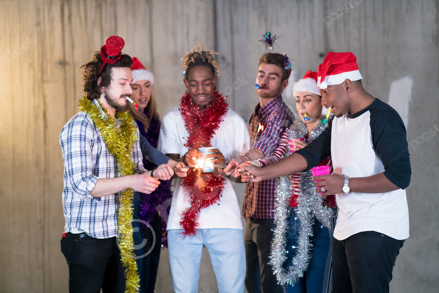 Smiling Middle Eastern businessman sitting at table working on computer with diverse colleagues standing in office
