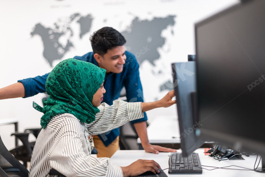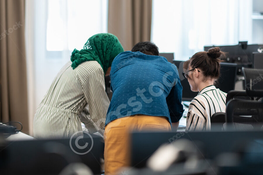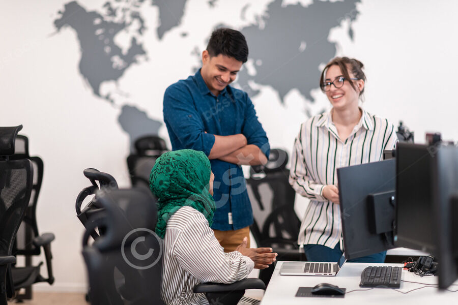 Smiling Black and Muslim college students having conversation and team meeting working together on homework while standing against gray background in studio