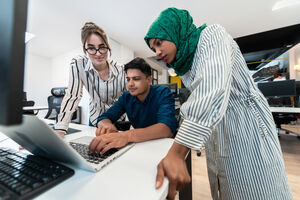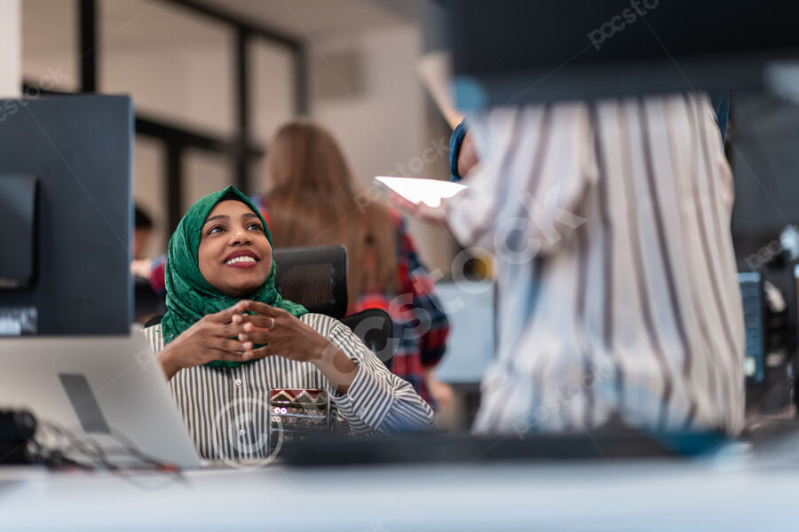 Smiling Black woman in hijab showing smartphone to Middle Eastern and Black friends while standing at home