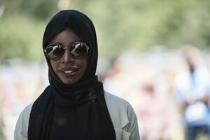 Smiling Muslim woman wearing hijab and sunglasses standing near people talking at a local honey production farm during daytime