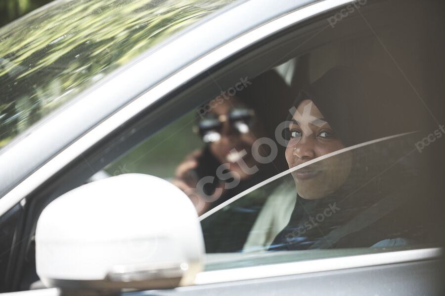 Smiling Middle Eastern woman in hijab driving car with Muslim female friend on road during daytime