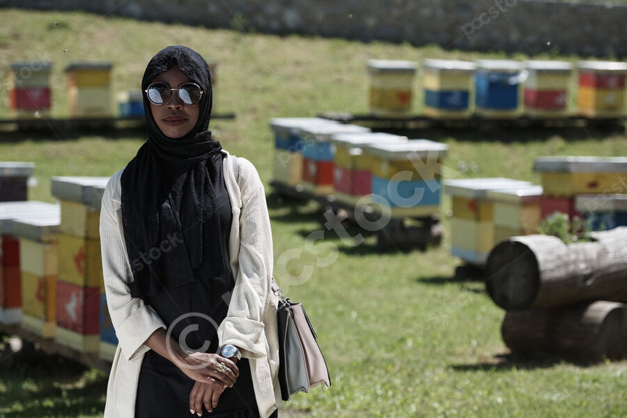 Smiling Muslim woman wearing hijab and sunglasses standing with hand on waist in local honey production farm during daytime