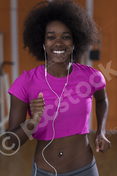 Smiling Black woman with afro wearing pink shirt and earphones standing on treadmill in gym