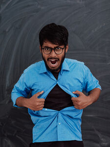 Angry Indian man with eyeglasses taking long sleeves off while standing against chalkboard in classroom