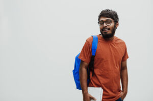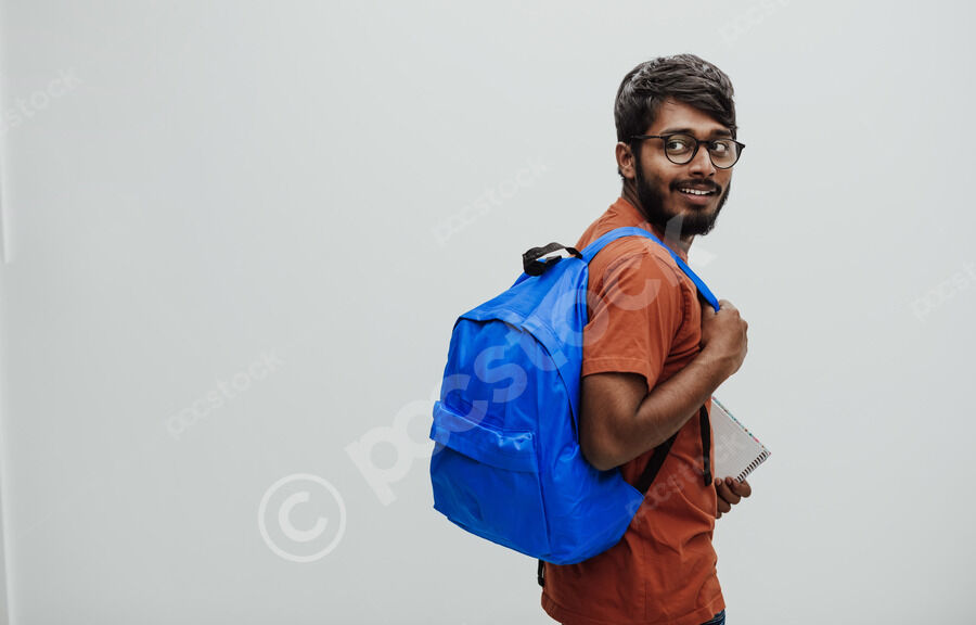 Smiling Indian man in orange shirt with eyeglasses and blue backpack standing against white background in studio