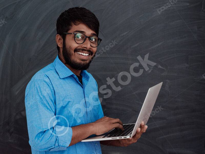 Smiling Indian man in blue long sleeves with eyeglasses holding laptop while standing against chalkboard in classroom