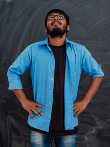 A young Indian student in a blue shirt with glasses posing with his arms crossed in front of the school blackboard.