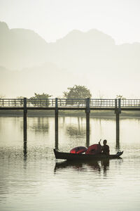 A young Buddhist monk standing with an umbrella on a footbridge above water, mountains in the mist at dawn