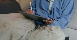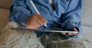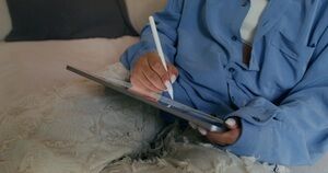 Cropped video of Black woman with curly afro using tablet with stylus pen while sitting on couch in living room at home