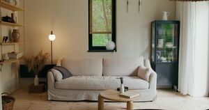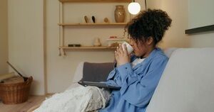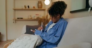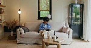 Black woman with curly afro drinking coffee while sitting on couch in living room at home