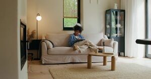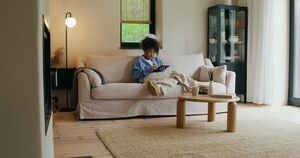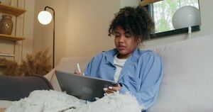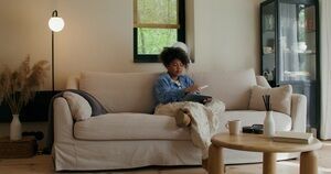 Black woman with curly afro using tablet while sitting on couch in living room at home