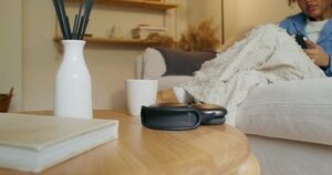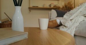 Cropped video of Black woman drinking coffee while sitting on couch in living room at home