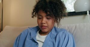 Black woman with curly afro looking away while sitting on couch in living room at home