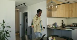 Black man wearing headphones and eyeglasses talking on video chat in his apartment