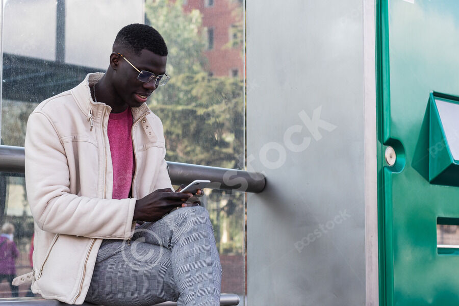 Smiling Black man with eyeglasses using smartphone sitting with crossed leg on city bus station during daytime