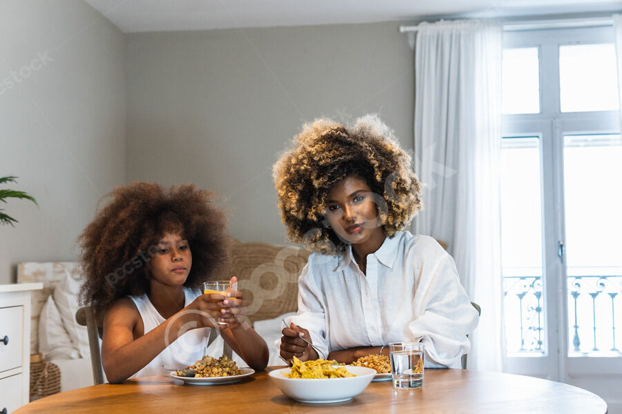 Cheerful mixed race girl with afro looking away sitting at table with her mother eating snacks together at home