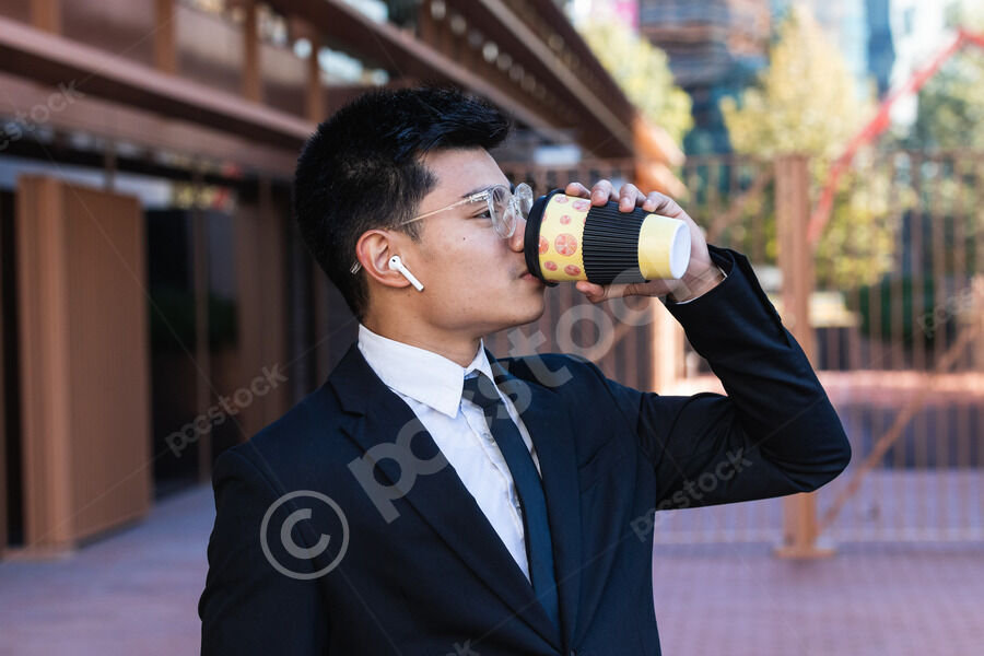 Serious Asian businessman wearing wireless earphones and eyeglasses drinking coffee looking away while standing on city street during daytime
