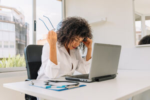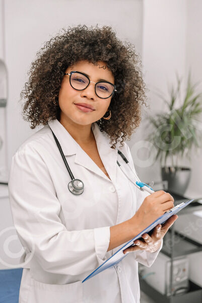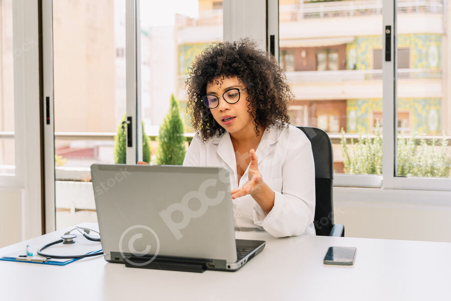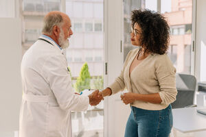 Black female patient with curly hair wearing eyeglasses sitting on bed and listening to senior caucasian male doctor explaining medical results in clinic