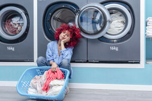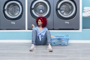 Hispanic woman with red curly hair leaning her face on her hand while crouching and holding blue basket with dirty clothes in front of washing machines in the laundry room