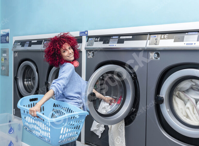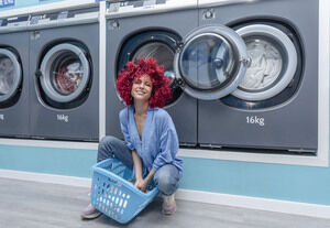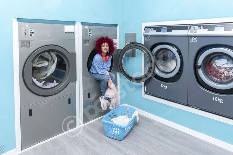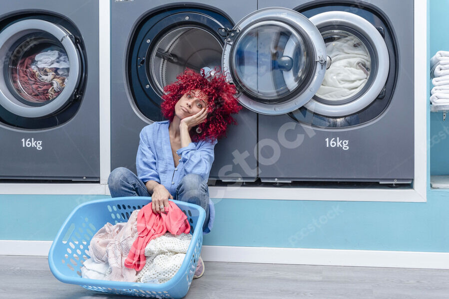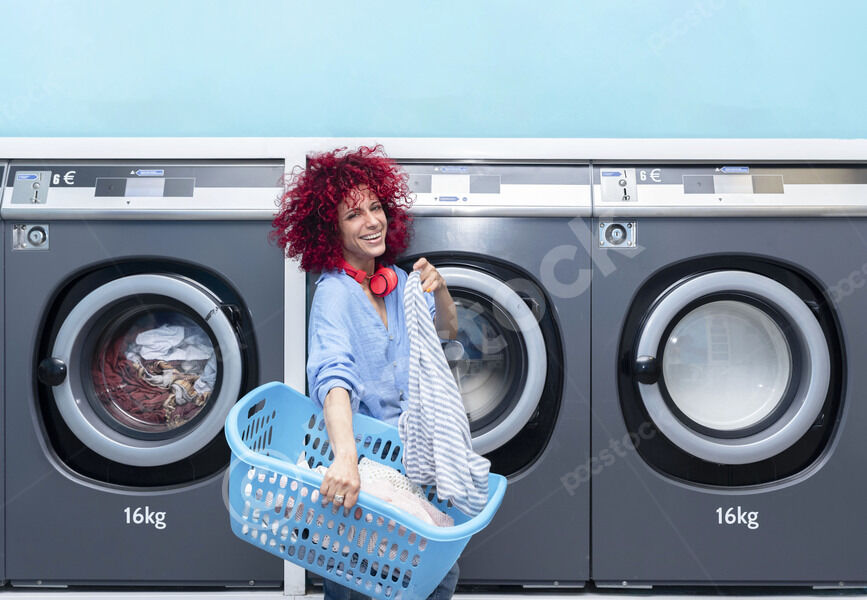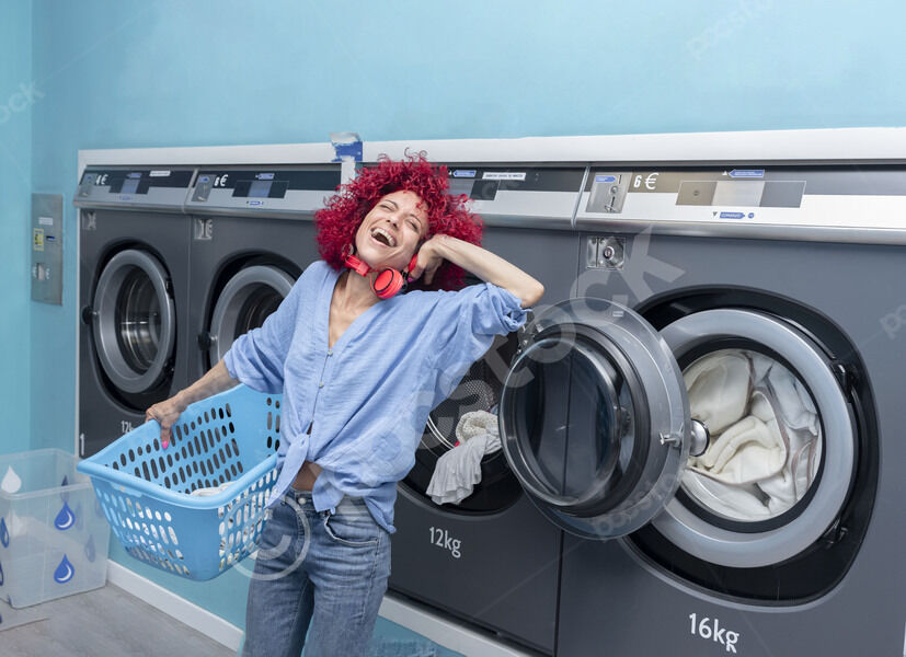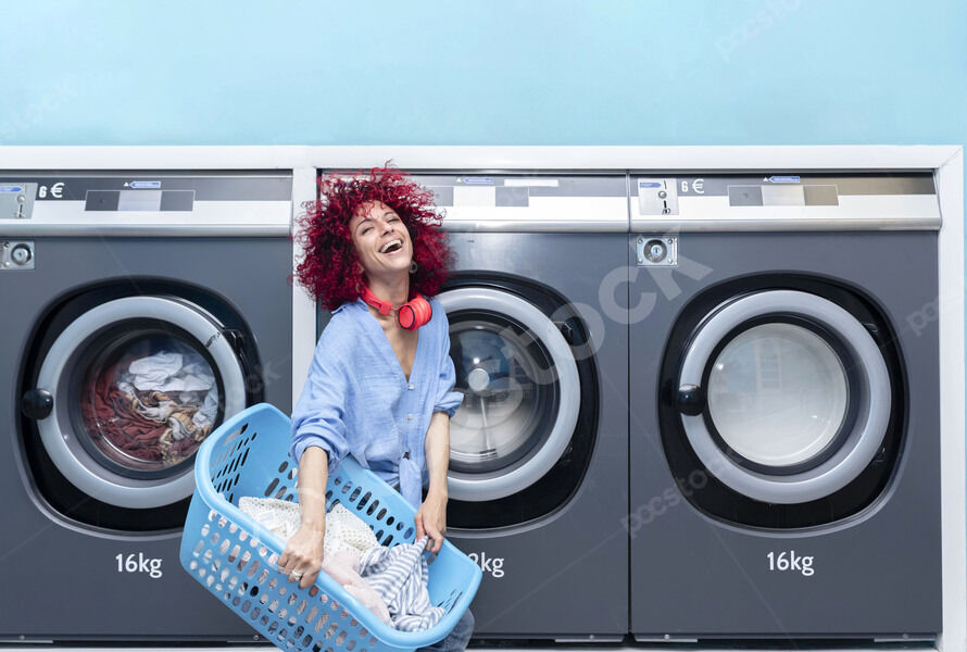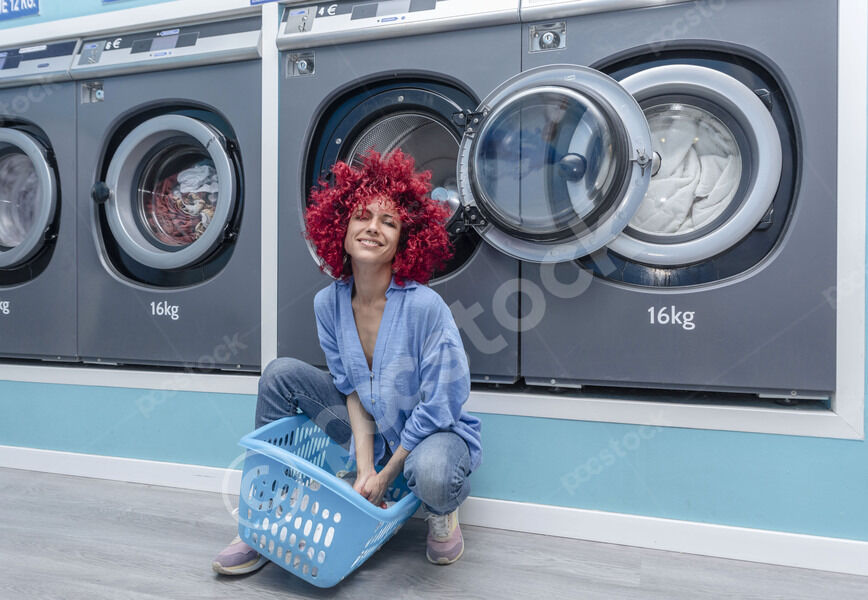 Hispanic woman with red curly hair sitting on blue basket in front of washing machines in the laundry room
