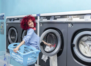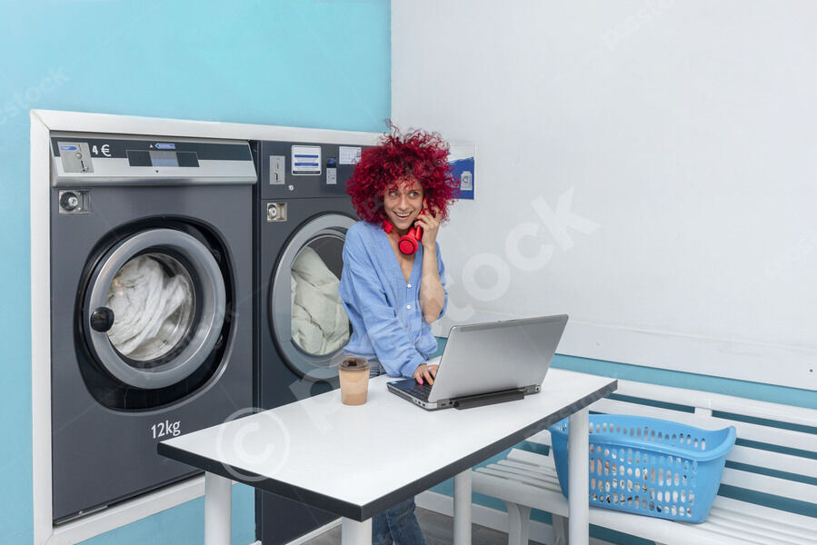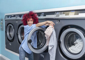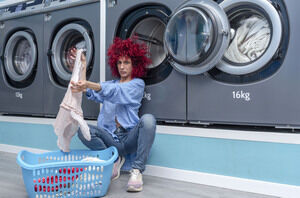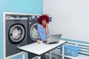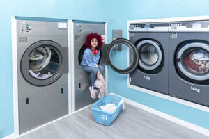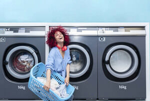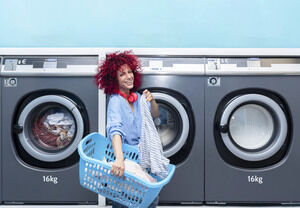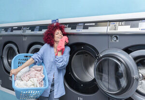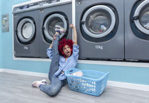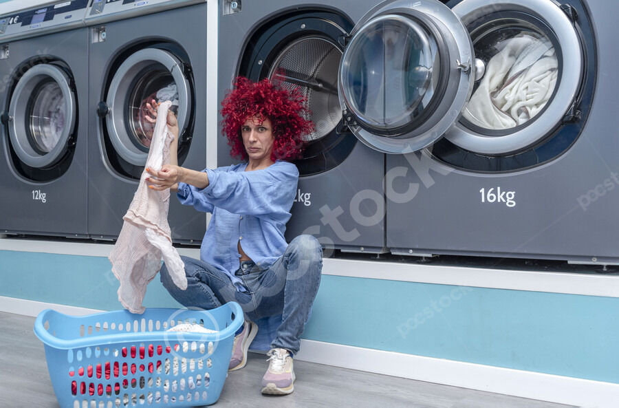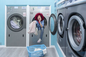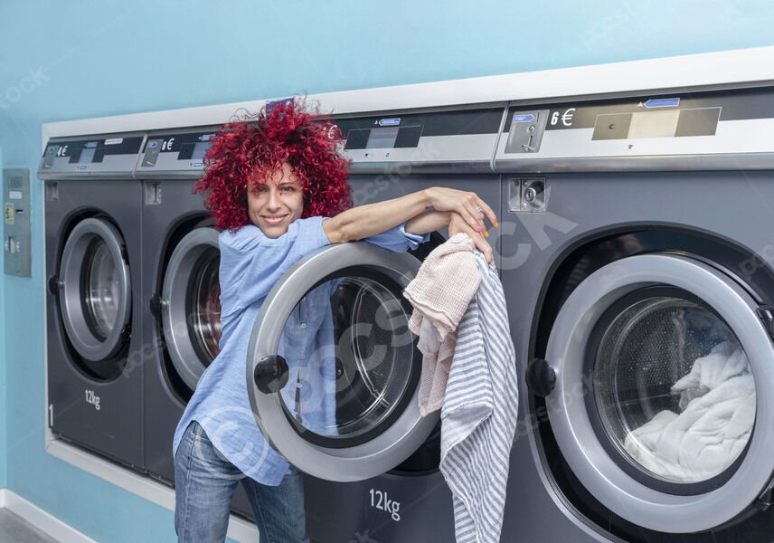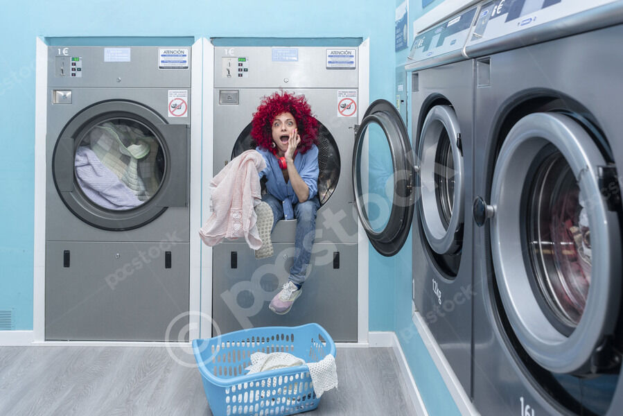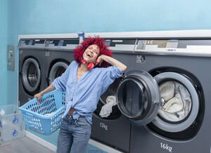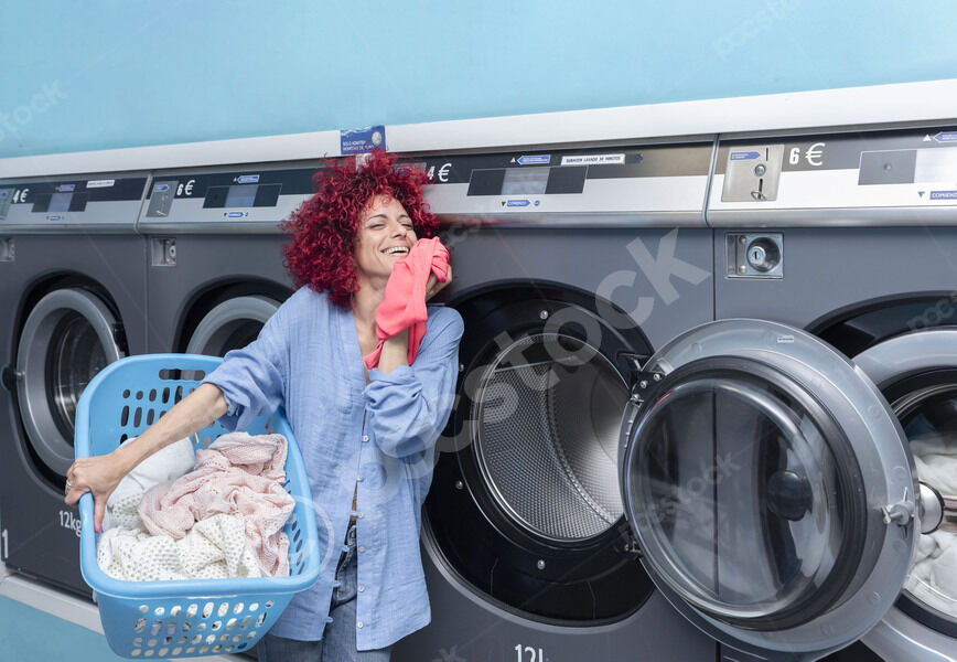 Hispanic woman with red curly hair sitting on blue basket in front of washing machines in the laundry room