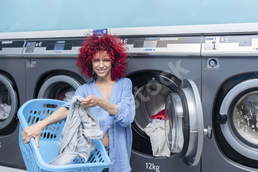 Hispanic woman with red curly hair holding blue basket and taking out clothes from washing machine while standing in the laundry room