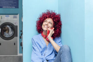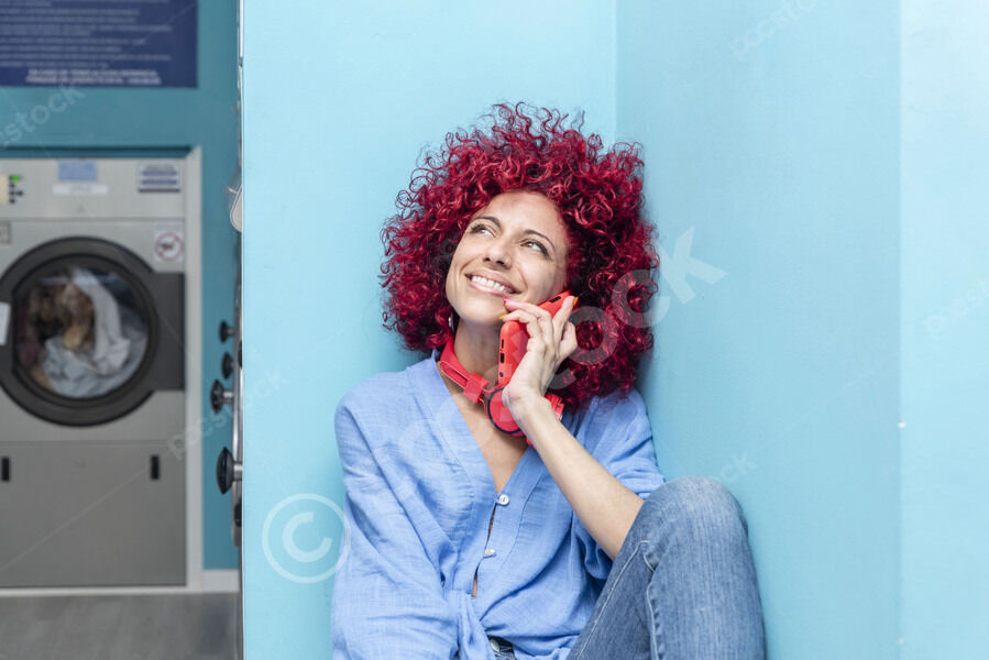 Hispanic woman with red curly hair wearing headphones around her neck talking on mobile phone and looking up sitting on corner wall in the laundry room