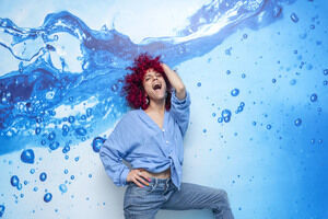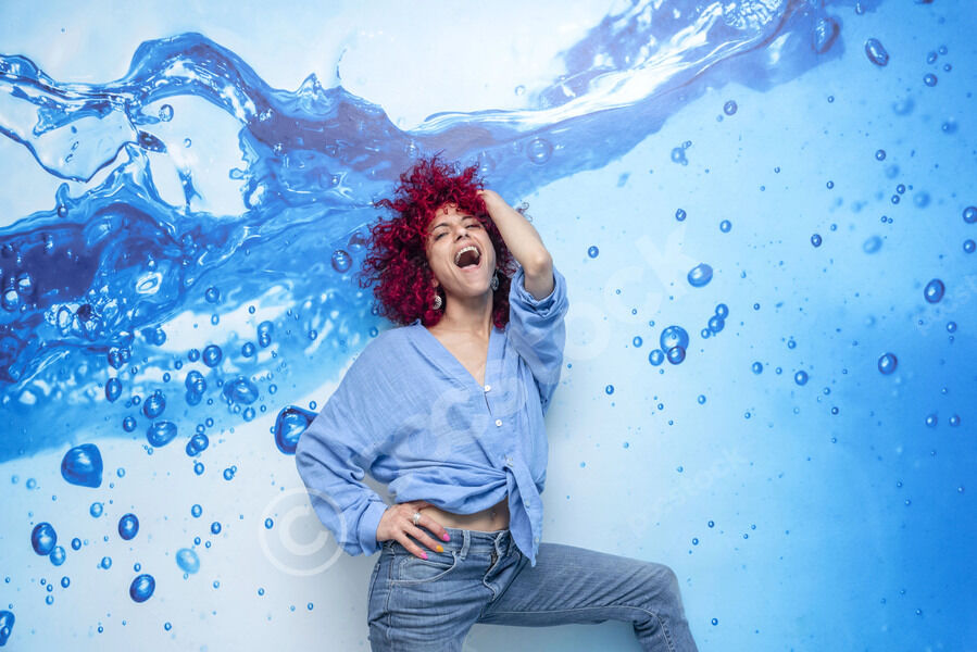 Hispanic woman with red curly hair laughing with hand on her head and waist standing with one leg up in front of blue water splash and drops wall in the laundry room