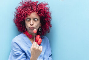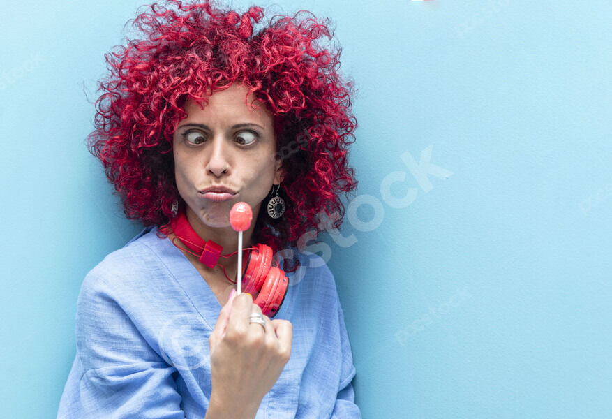 Hispanic woman with red curly hair wearing headphones around her neck holding lollipop and making funny face while sitting against blue wall