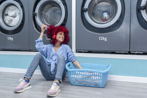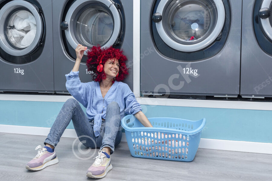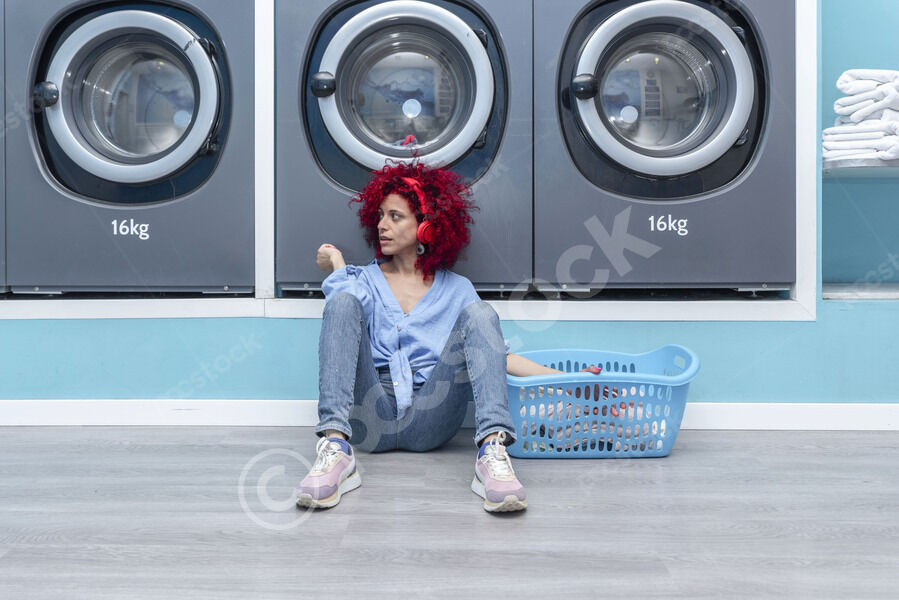 Hispanic woman with red curly hair listening to music on headphones and looking sideways sitting on floor beside the blue basket in the laundry room