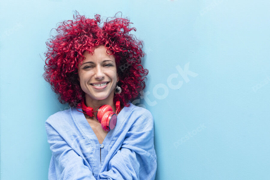 Hispanic woman with red curly hair wearing headphones around her neck smiling while sitting against blue wall