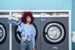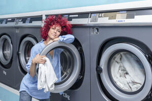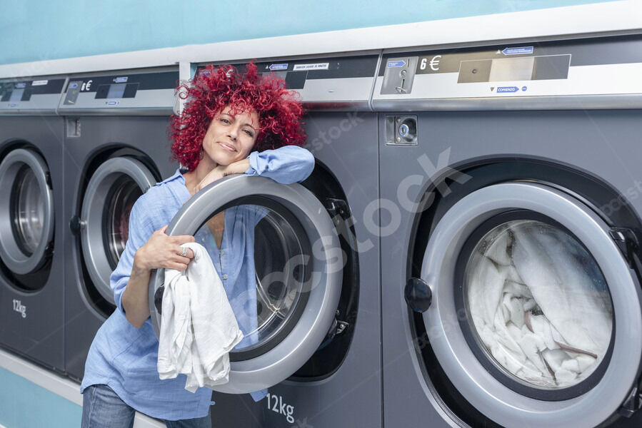 Hispanic woman with red curly hair holding clothes leaning on door of washing machine while standing and doing laundry in the laundry room