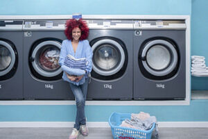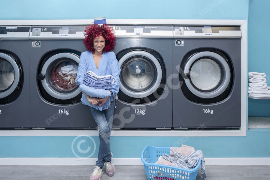 Hispanic woman with red curly hair holding folded clothes and smiling while standing in front of washing machines in the laundry room