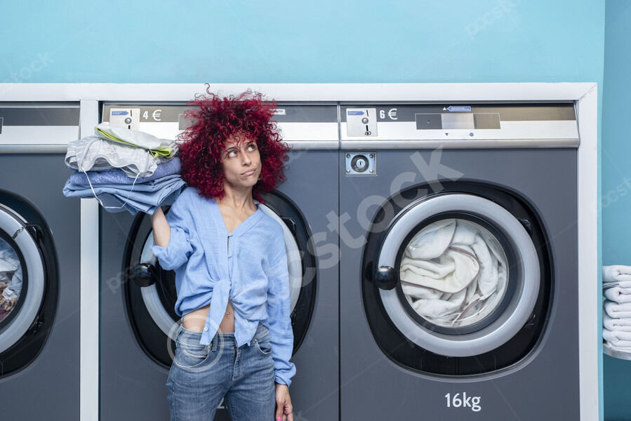Hispanic woman with red curly hair holding folded clothes and looking up standing in front of washing machines in the laundry room