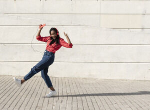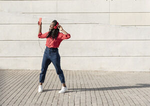 Black woman with headphones listening to music holding smartphone dancing outdoors on a sunny day