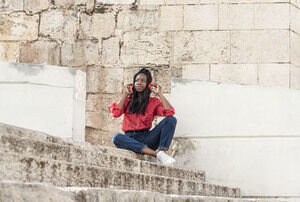 Black woman with braids listening to music using headphones looking away while sitting on stair steps outdoors during daytime