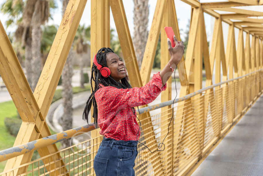 Black woman with headphones taking a selfie using smartphone while standing on yellow bridge during daytime
