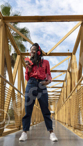 Black woman with headphones listening to music holding smartphone and standing on yellow bridge during daytime