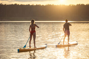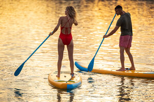 Hispanic man paddling on beach with caucasian female friend while standing on surfboard during sunset